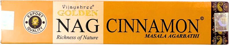 Golden Nag Cinnamon sunt bețișoare parfumate indiene, lucrate manual cu grijă și pricepere. Se mai numesc Agarbatti și sunt realizate din flori, lemne, uleiuri, rășini sau condimente naturale. Prezintă o aromă deosebită, cu tonuri dulci, blânde și calde, în care esențele lemnoase de santal se întrepătrund cu cele florale vanilate, alcătuind un amestec (masala) exotic de neuitat. Aceste bețișoare naturale sunt recomandate pentru relaxare, yoga, meditație, promovează o stare de bine, reîmprospătează și curăță energia spațiului. Durata de ardere a unui bețișor este de aproximativ o oră.