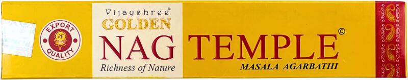 Golden Nag Temple sunt bețișoare parfumate indiene, lucrate manual cu grijă și pricepere. Se mai numesc Agarbatti și sunt realizate din flori, lemne, uleiuri, rășini sau condimente naturale. Prezintă o aromă deosebită, cu tonuri dulci, blânde și calde, în care esențele lemnoase de santal se întrepătrund cu cele florale vanilate, alcătuind un amestec (masala) exotic de neuitat. Aceste bețișoare naturale sunt recomandate pentru relaxare, yoga, meditație, promovează o stare de bine, reîmprospătează și curăță energia spațiului. Durata de ardere a unui bețișor este de aproximativ o oră.