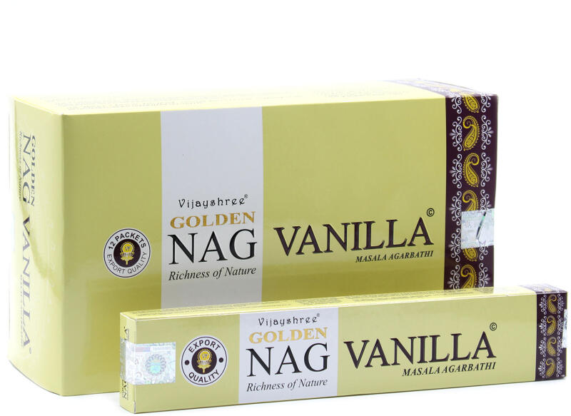 Golden Vanila sunt bețișoare parfumate indiene, lucrate manual cu grijă și pricepere. Se mai numesc Agarbatti și sunt realizate din flori, lemne, uleiuri, rășini sau condimente naturale. Prezintă o aromă specială, de vanilie, dulce și caramelizată, ce rămâne în aer pentru o perioadă îndelungată de timp. Aceste bețișoare naturale sunt recomandate pentru relaxare, yoga, meditație, promovează o stare de bine, reîmprospătează și curăță energia spațiului. Durata de ardere a unui bețișor este de aproximativ o oră.